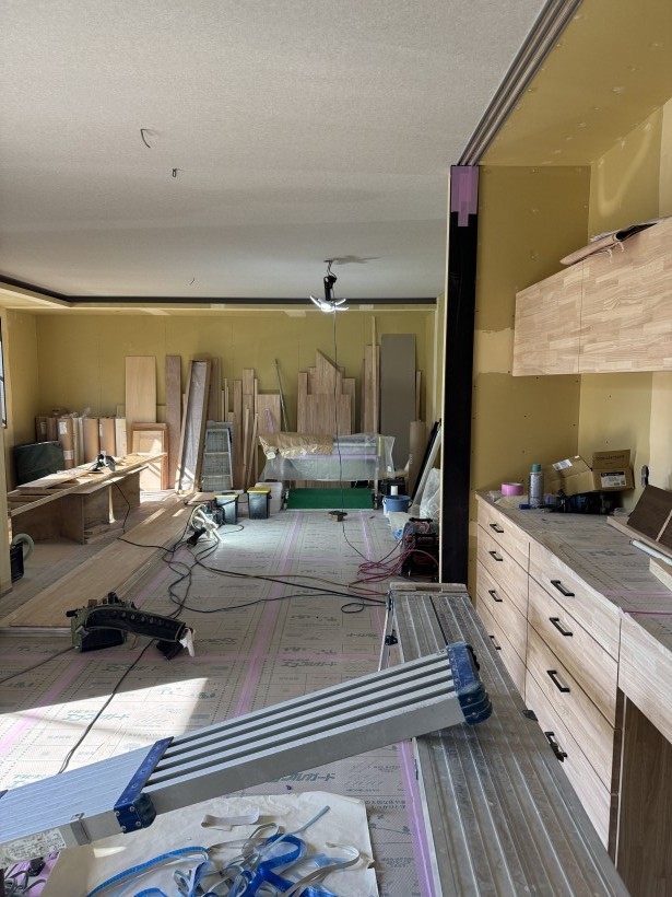 13日のキッチン施工に向けて先ずはLDKの天井から。